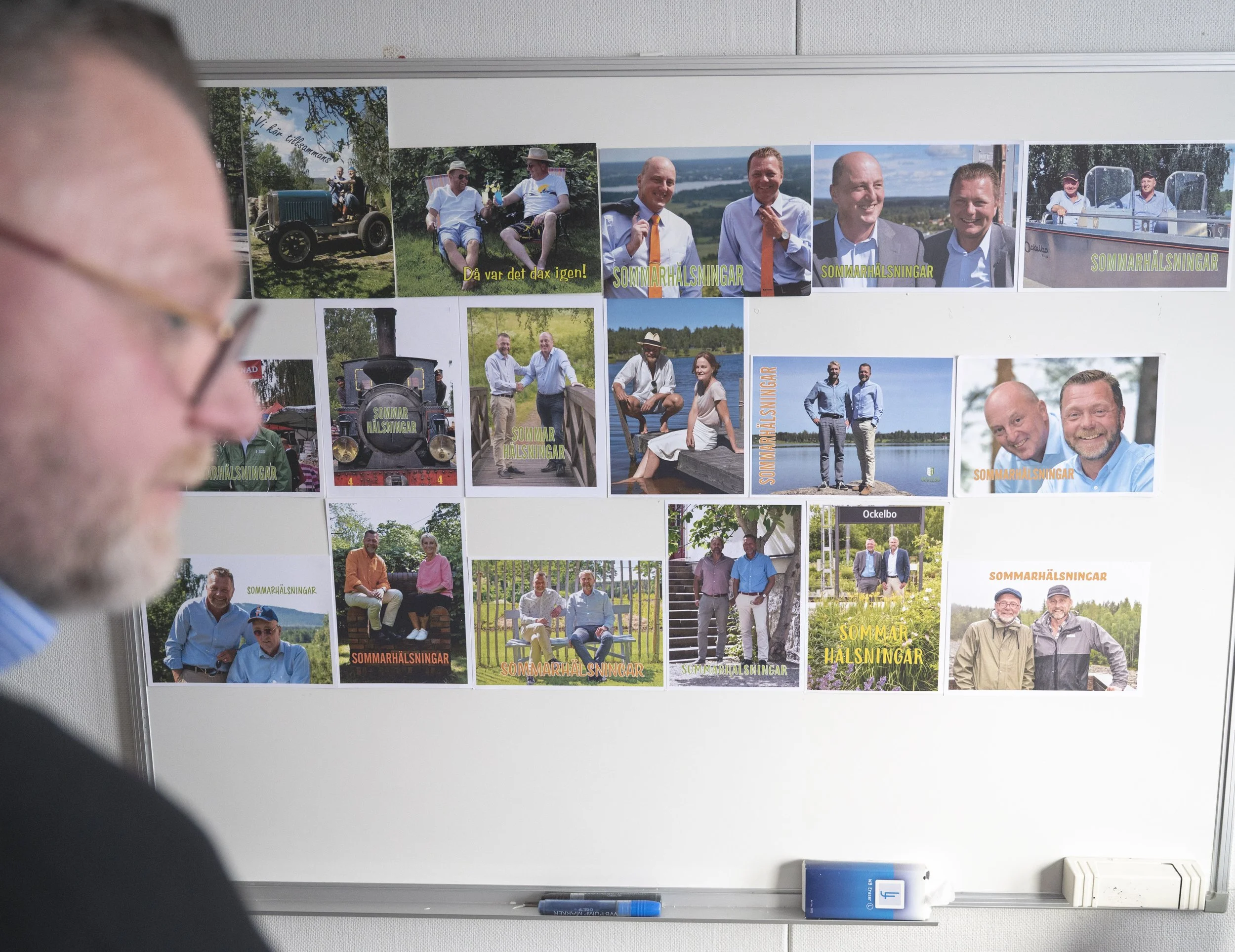 På whiteboarden på Monica Åkessons kontor är alla sommarhälsningar uppsatta. Den gemensamma nämnaren är Magnus Jonsson med en rad kommunchefer genom åren. Foto: Henrik Westberg, Kuxabladet