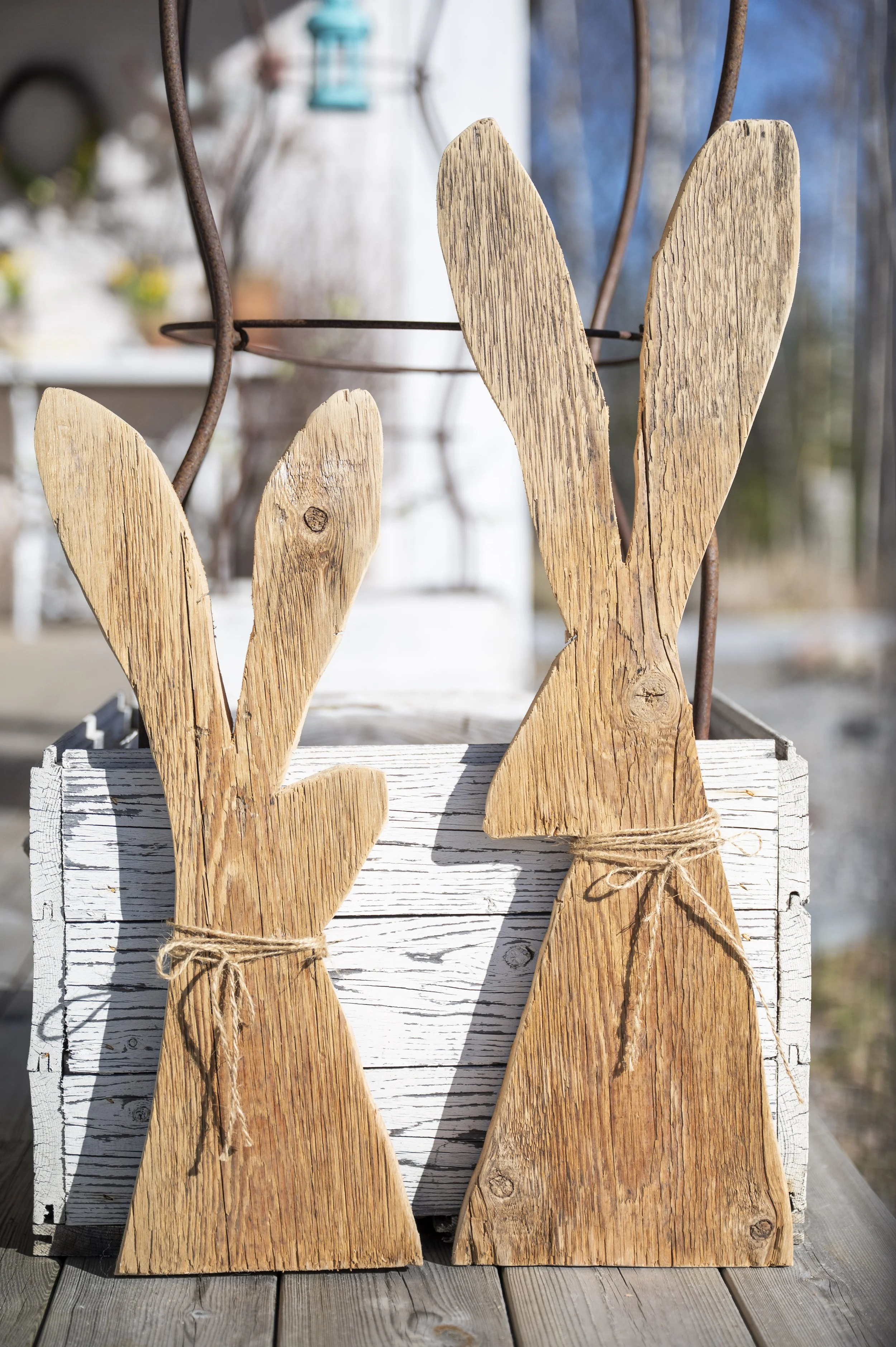 Jag har också gjort påskharar av gamla brädor som fanns i gömmorna på vår gård. Jag gjorde först en skiss med enkla mått, Sedan ritade jag ut formen på brädorna och sågade ut med sticksåg. Väldigt roligt och lagom svårt. Man kan säkert hitta på andra trevliga silhuetter.