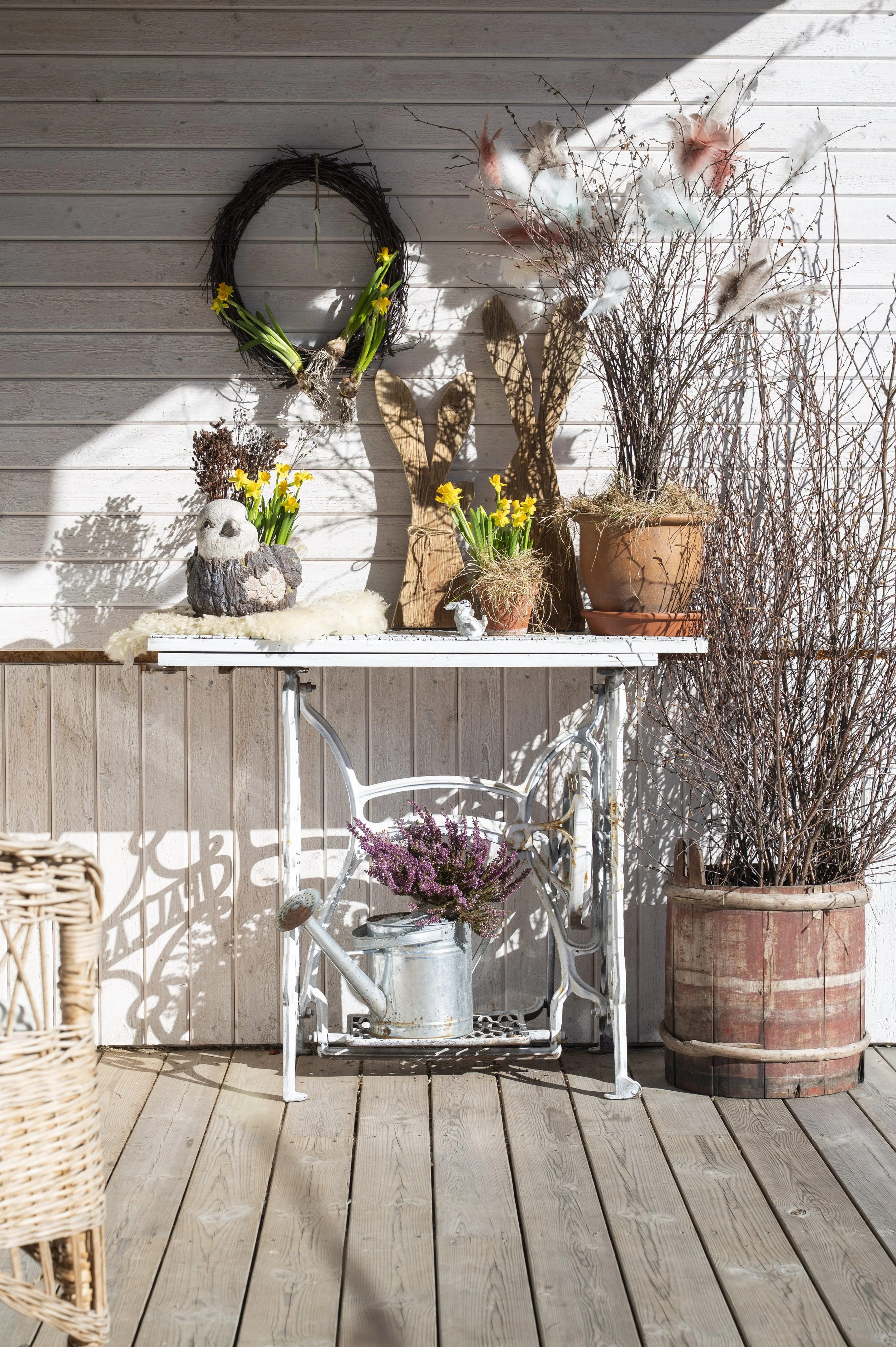 Både Björkriskrans och påskharar får pryda mitt årstidsbord som står vid entrén.