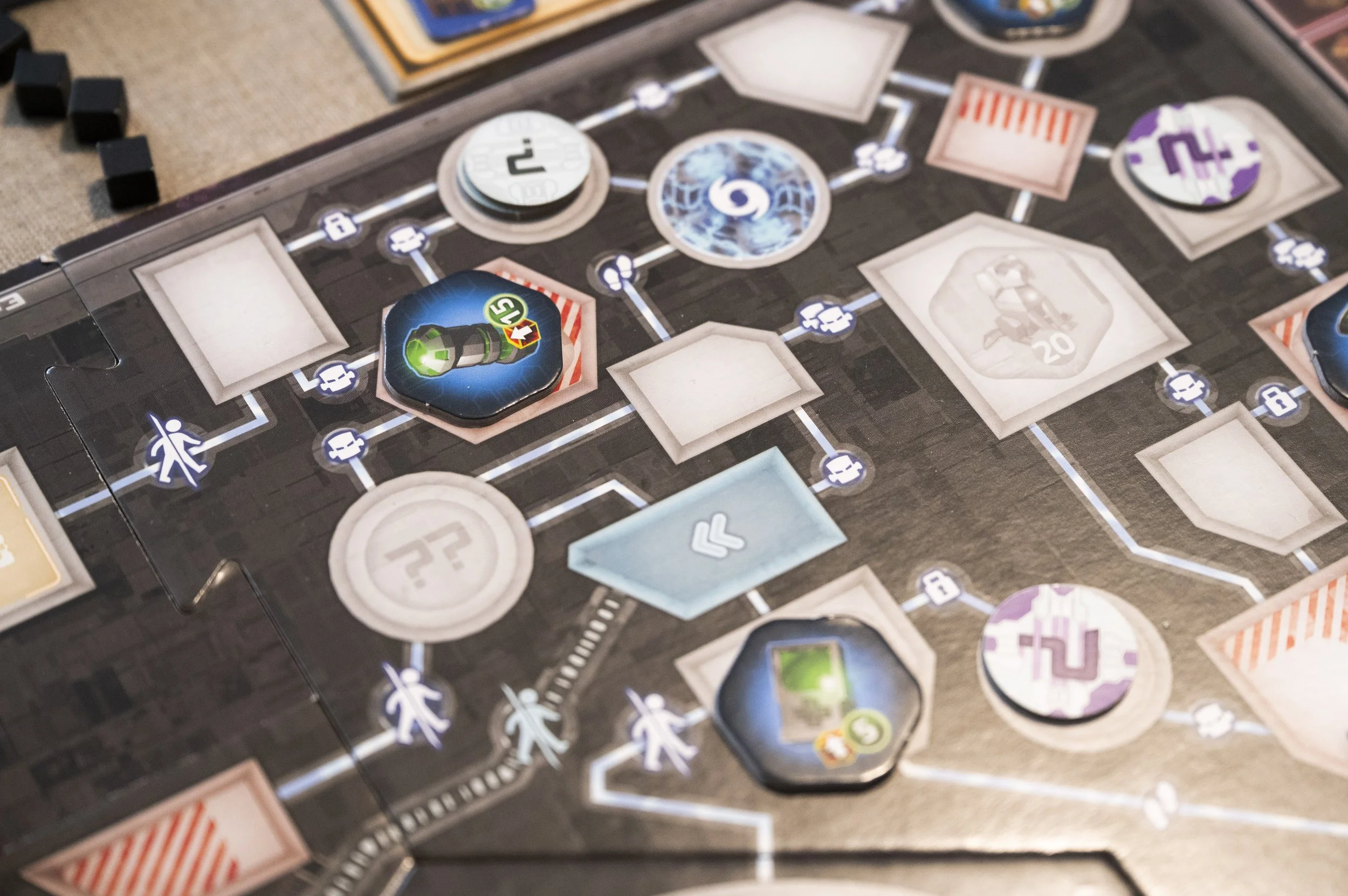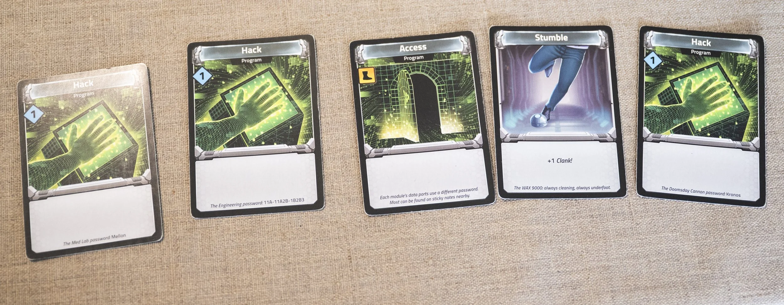 Artefakter som du ska sno. En husregel vi kör med är upp och nedvända brickor, när du hackat en dator får du vända på valfri bricka och själv se vad det är under.
