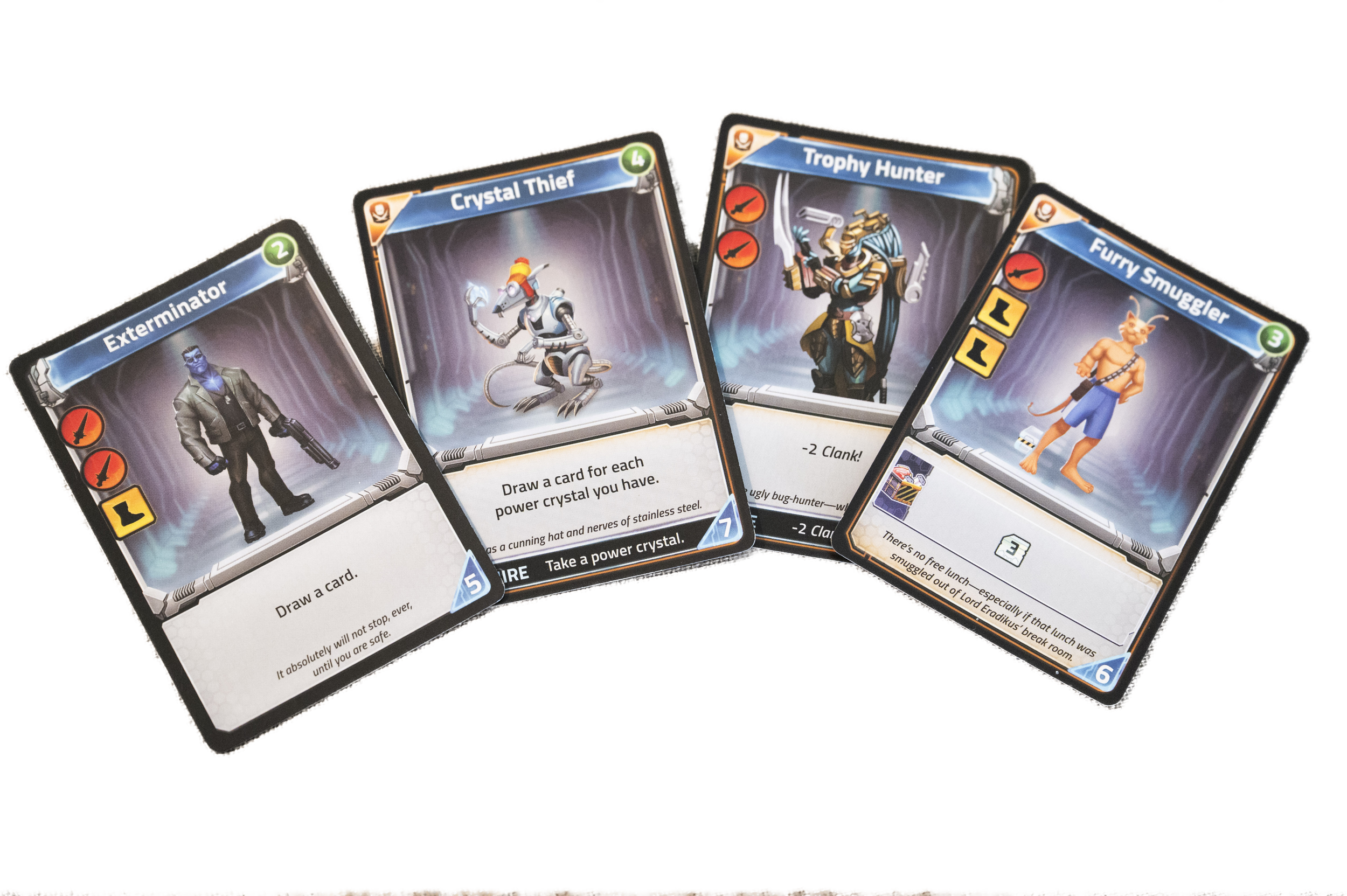 Exempel på kort att införskaffa. Exterminator ger två “attack” och ett fotsteg. Trophy Hunter ger -2 Clank! De tas från…